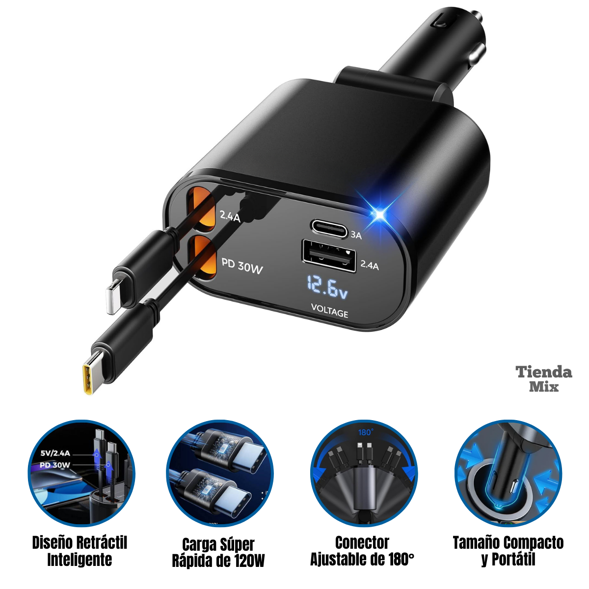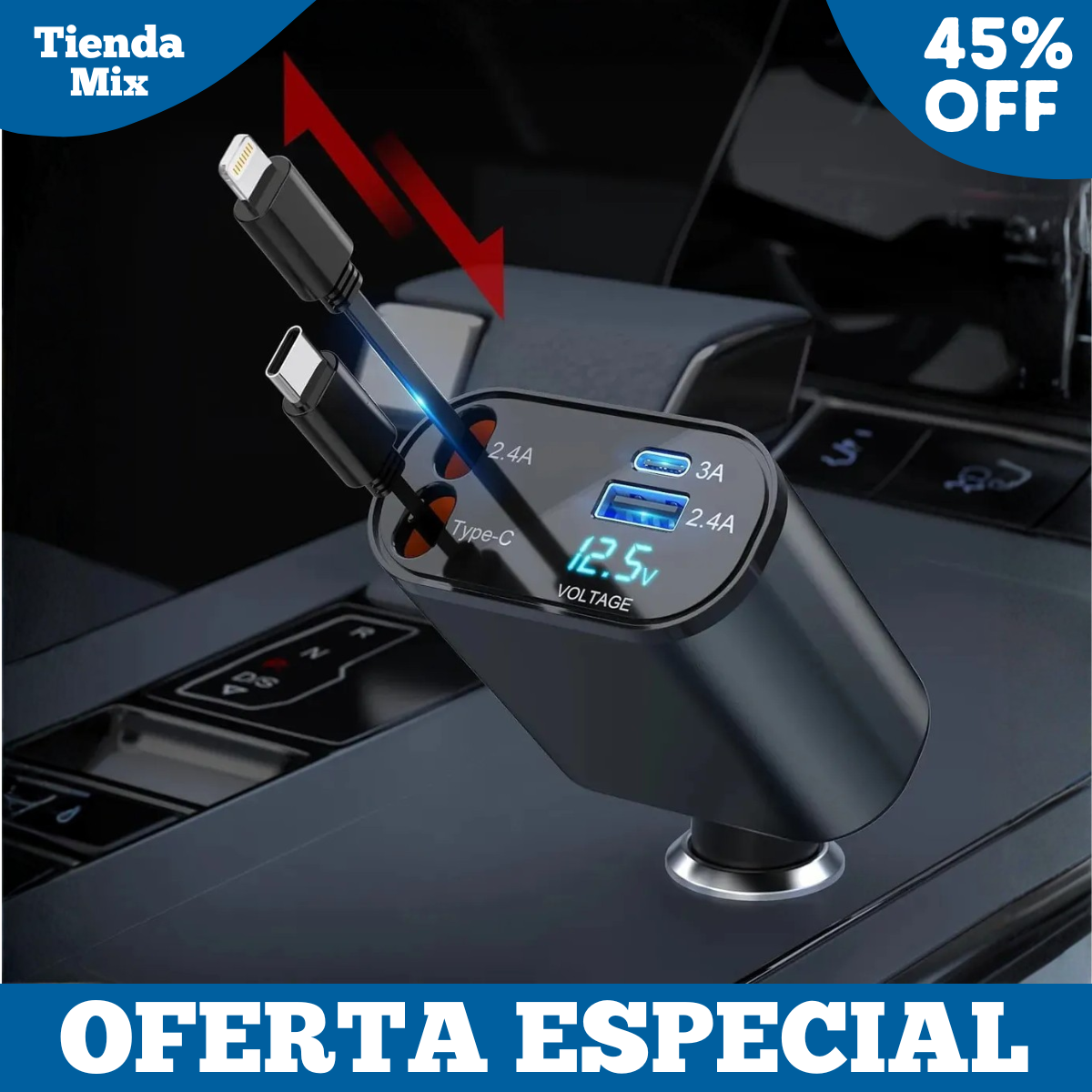 Con el Cargador Retráctil 4 en 1, transformas tu experiencia de carga en el coche. Su diseño compacto y funcional elimina el caos de cables y te permite cargar múltiples dispositivos de forma rápida y segura. Ideal para viajes largos, trayectos diarios o para mantener a todos los pasajeros conectados sin estrés.
