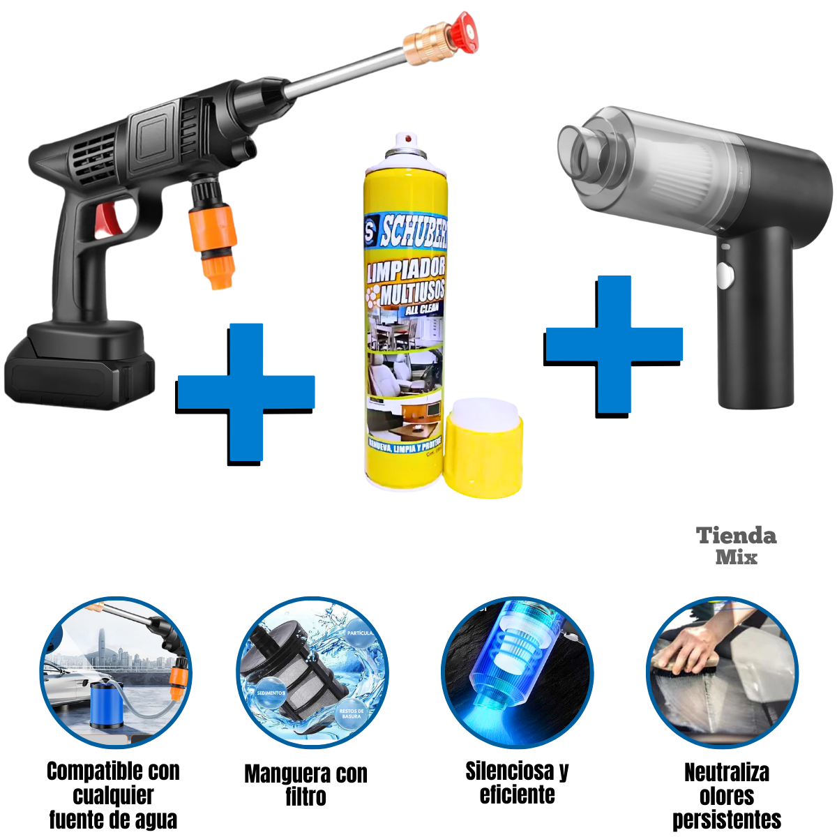 Combo 3x1 único: hidrolavadora + mini aspiradora + espuma multiusos, todo integrado para limpieza profesional.