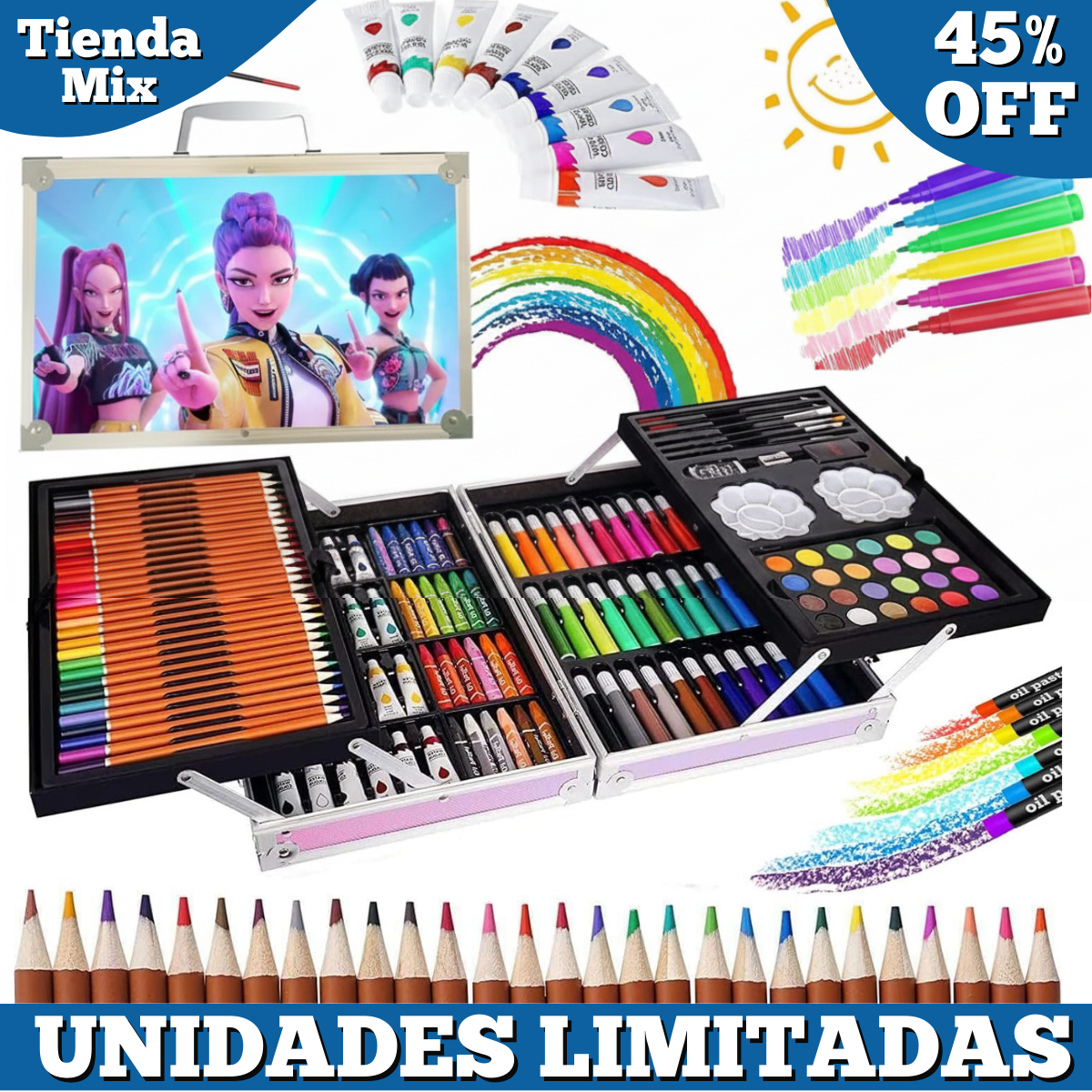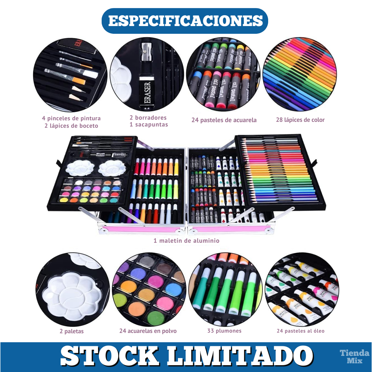 Set completo de 145 piezas: lápices, marcadores, pinceles, acuarelas, pasteles y accesorios.